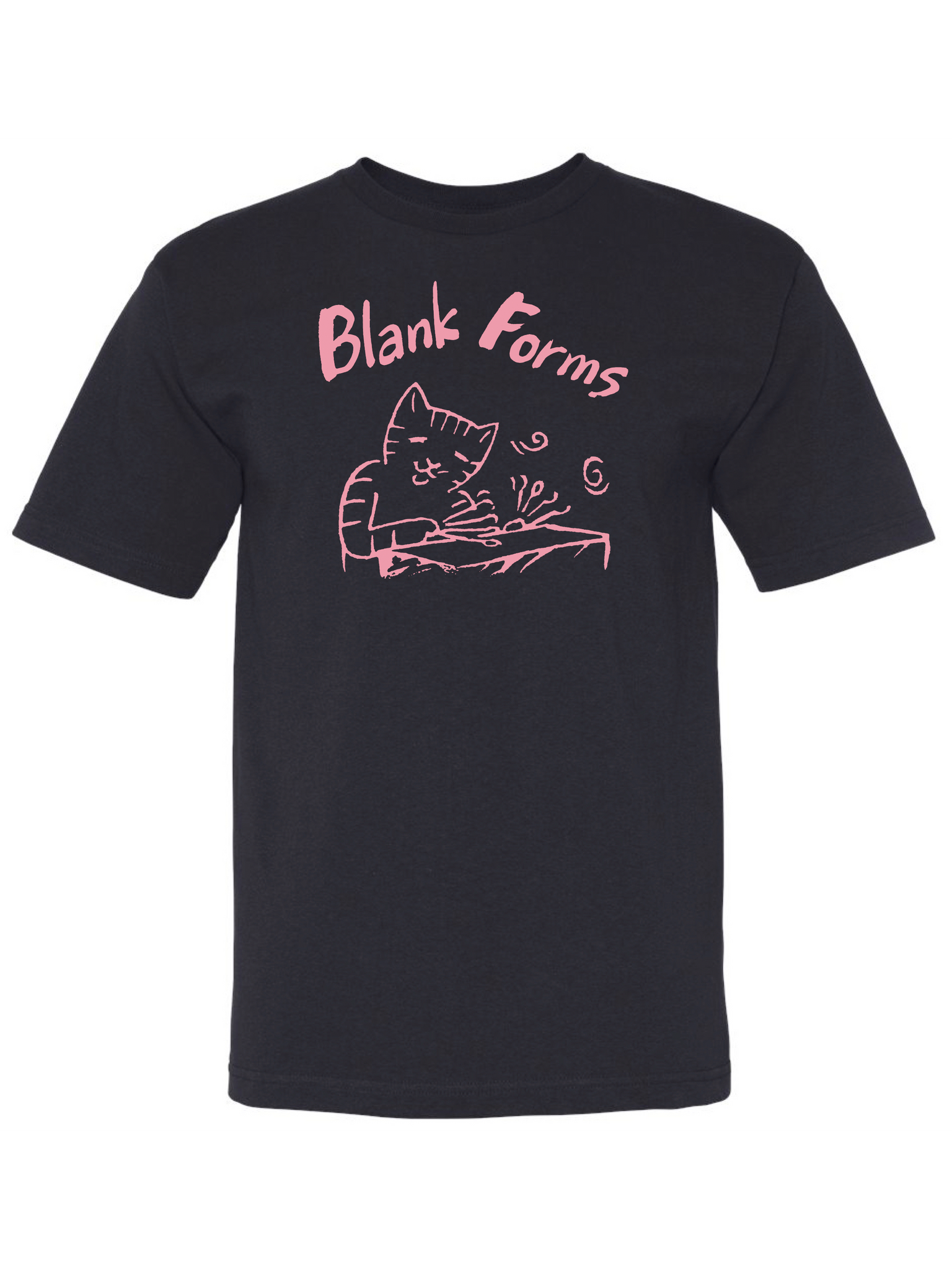 USA-made Bayside 5.4 oz., 100% pre-shrunk cotton t-shirt adorned with the Blank Forms logo designed by sound artist Akio Suzuki. Pink ink on navy blue shirt.