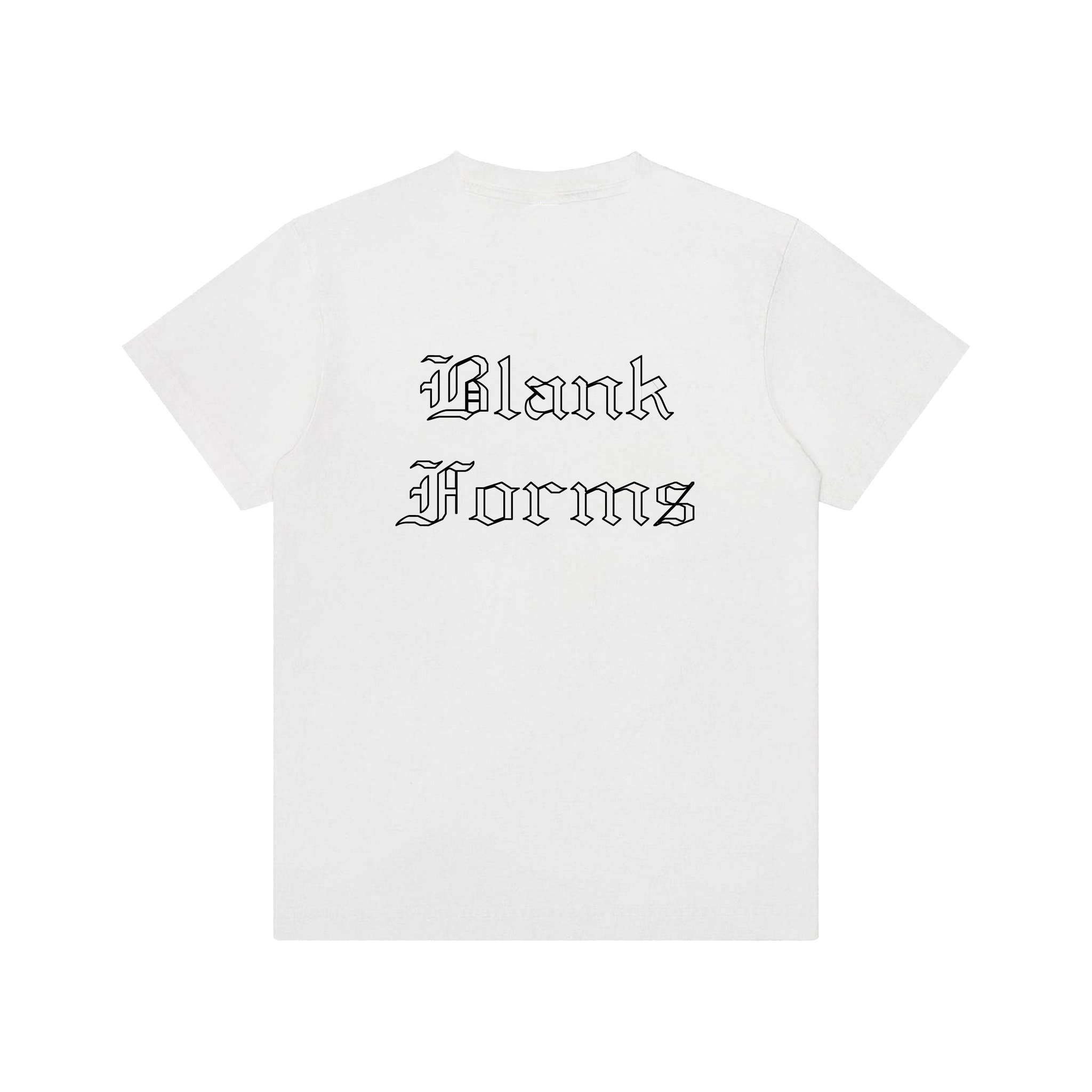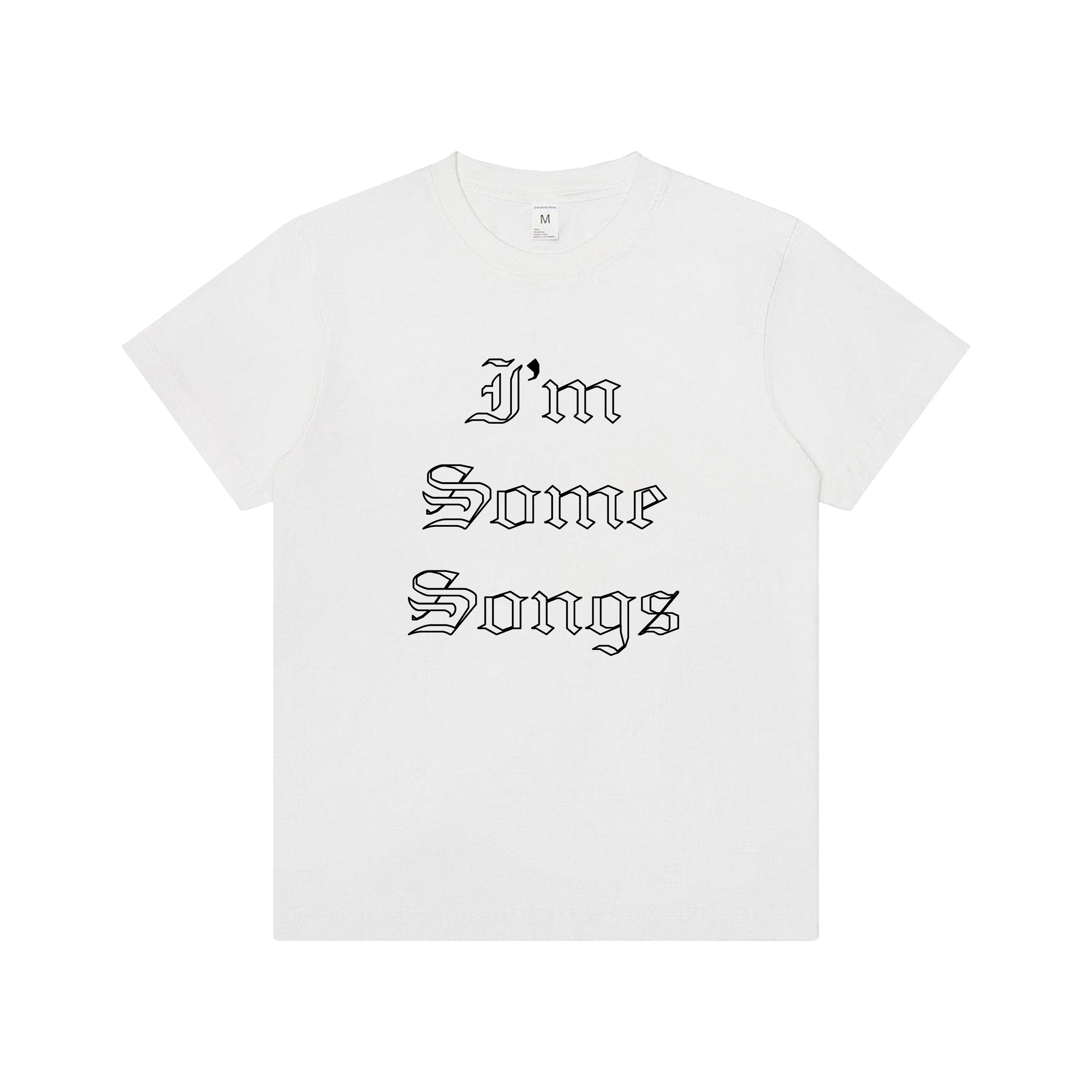 100% North American Reclaimed Waste Cotton, 6.5 oz, preshunk midweight white cotton t-shirt with "I'm Some Songs" on the front and "Blank Forms" on the back.